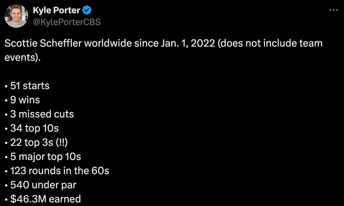 Scottie Scheffler took home the win at The Players Championship this past weekend and became the first ever back-to-back winner of the event. He is by far the best golfer in the world right now. To understand just how dominant he is, take a look at his run over the last two years.